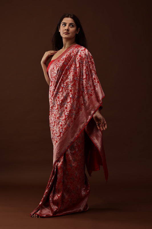A celebration of divine romance, Radha – The Eternal Love is a collection of pure silk Banarasi sarees woven with intricate gold and silver zari motifs. Inspired by Radha’s timeless grace, these sarees feature floral jaals, paisley vines, and meenakari accents in rich hues of red, blue, and emerald. Luxurious and elegant, each drape embodies devotion, beauty, and tradition.